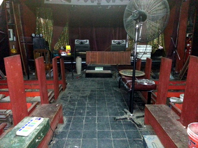 Estado que quedo luego de la renovación el escenario y la escenografia recuperada durante 2 semanas intensas de trabajo . Mas de un año y medio tardo en desaparecer y el olor y la humedad intensa casi imposible de sacar ..