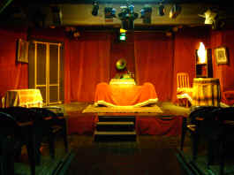 El escenario tiene un formato del tipo Wide Screem, que le da al espectador una sensación de estar dentro de la escena casi en una intima comunión con el actor . La disposición de los sillones sobre tarimas modulares elevadas de 12 centímetros por fila, dan una visión total de la escena. Cuanto mas atrás, mejor se ve.